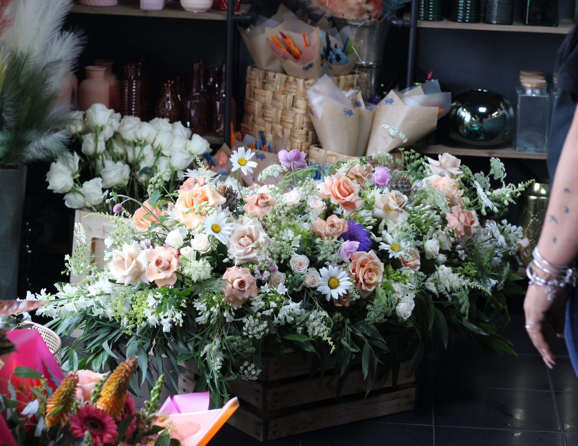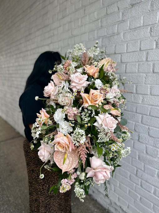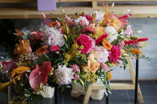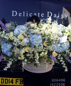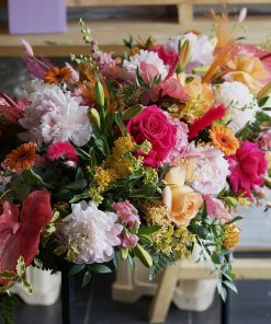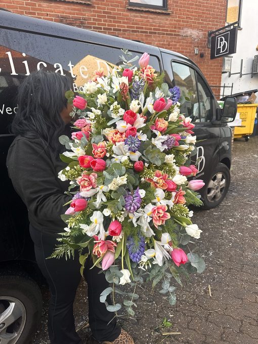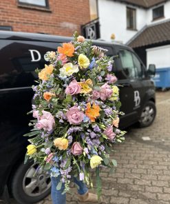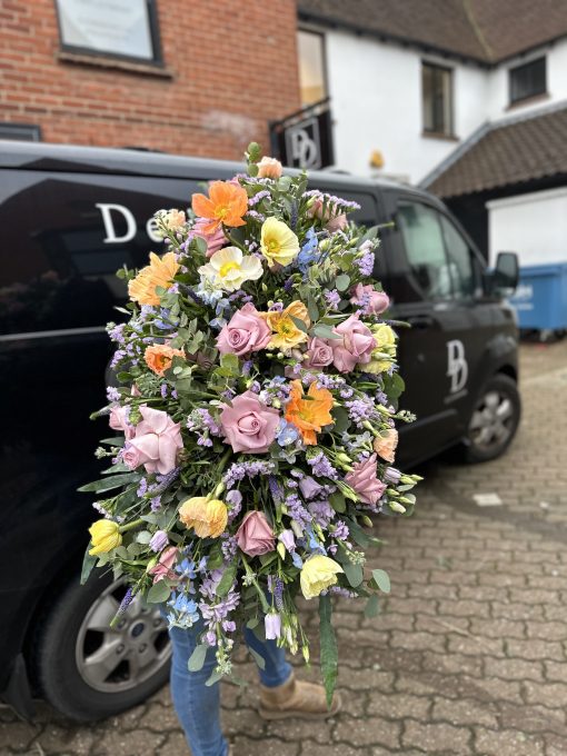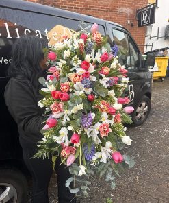 A double ended spray containing a lovely selection of Hydrangeas, Roses, Spray Carnations, Orchids and other seasonal flowers, with matching foliage.