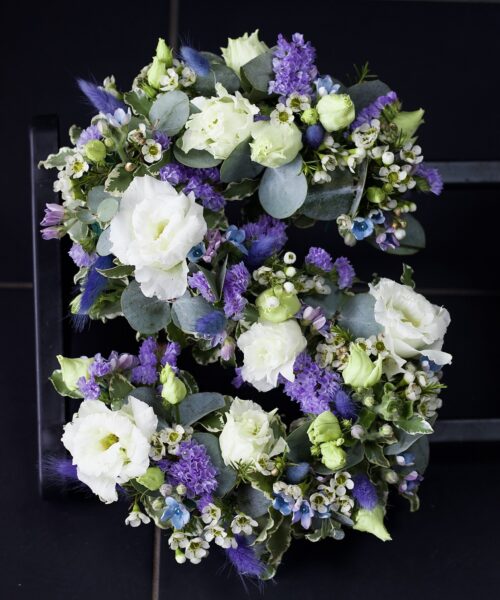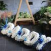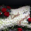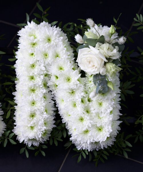 Based Letter – A white Chrysanthemum base with either a foliage edge or ribbon in a colour of your choice. We recommend a matching ribbon and flowers.
