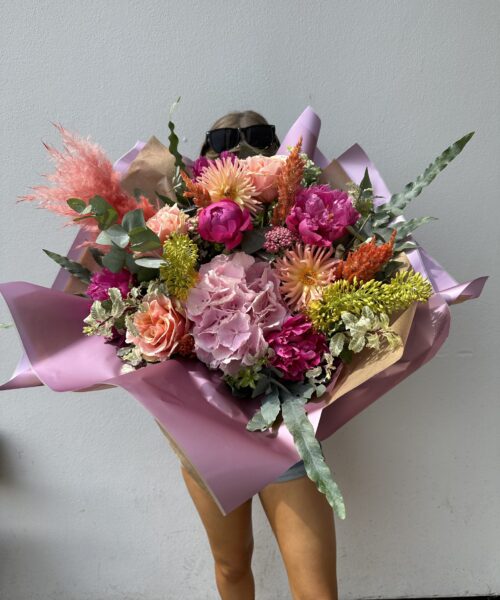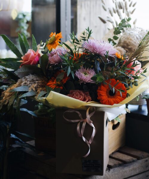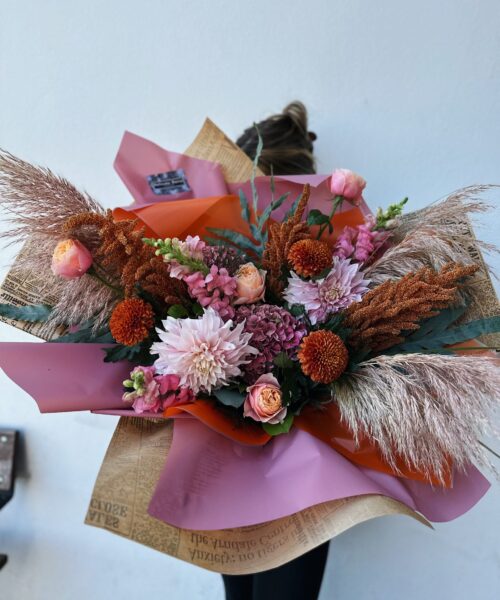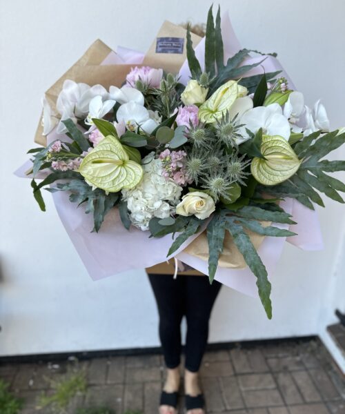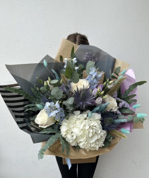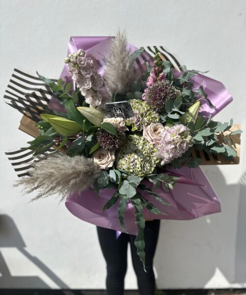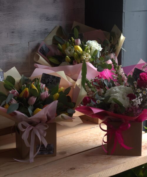 A selection of mixed hand tied bouquets with a range of gorgeous seasonal blooms and foliage. Presented with matching premium wrapping, bow and box. Available in a selection of choices.